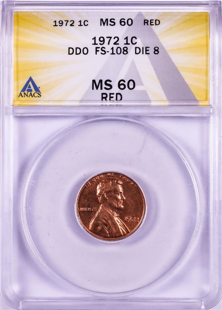 One 1972 Doubled Die Obverse FS-108 Die 8 Lincoln Cent Coin ANACS MS60 RED. ANACS Certified.