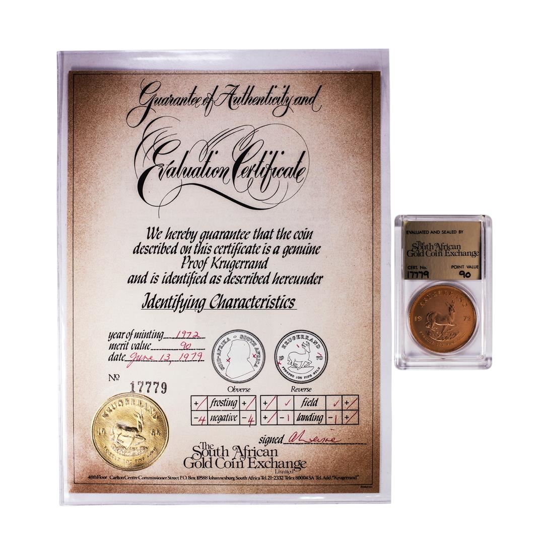One 1972 Proof South Africa 1oz Krugerrand Gold Coin w/COA.