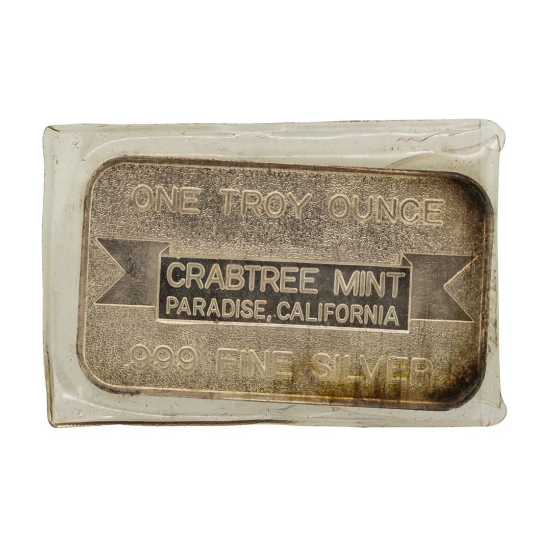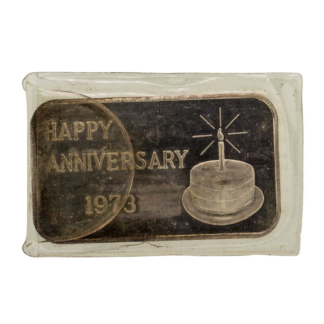 One 1973 Happy Anniversary Crabtree Mint Paradise, California 1 oz .999 Fine Silver Art Bar.