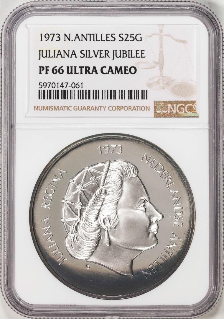 One 1973 Netherlands Antilles 25 Gulden Juliana Silver Jubilee Coin NGC PF66 Ultra Cameo. NGC Certified.