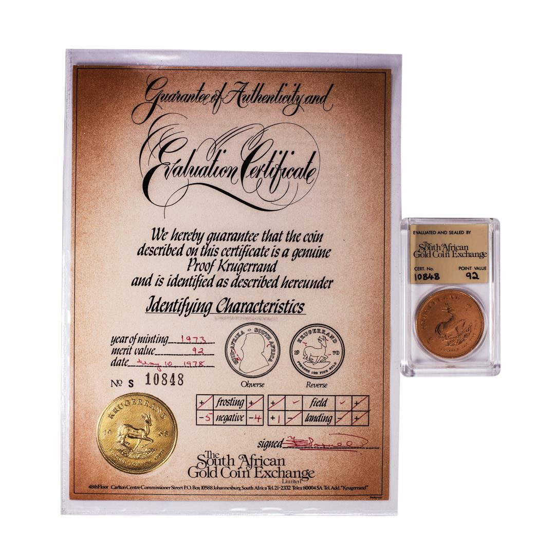 One 1973 Proof South Africa 1oz Krugerrand Gold Coin w/COA.