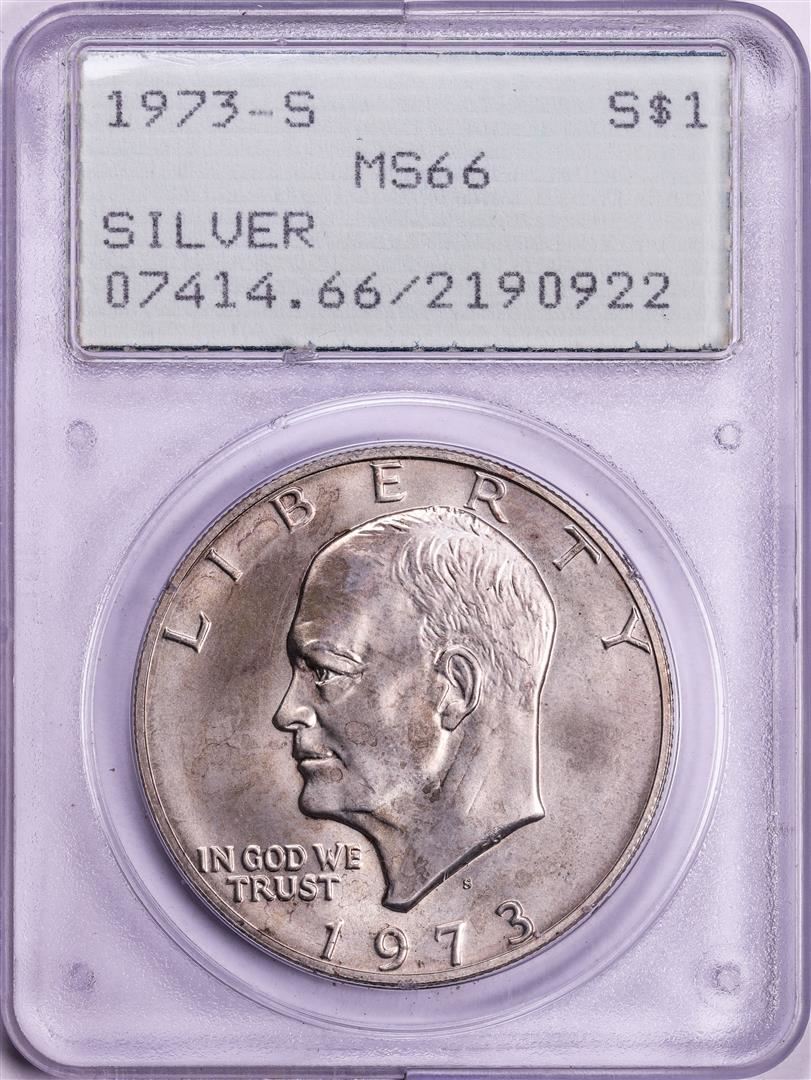 One 1973-S $1 Eisenhower Silver Dollar Coin PCGS MS66 Old Green Rattler Holder. PCGS Graded.