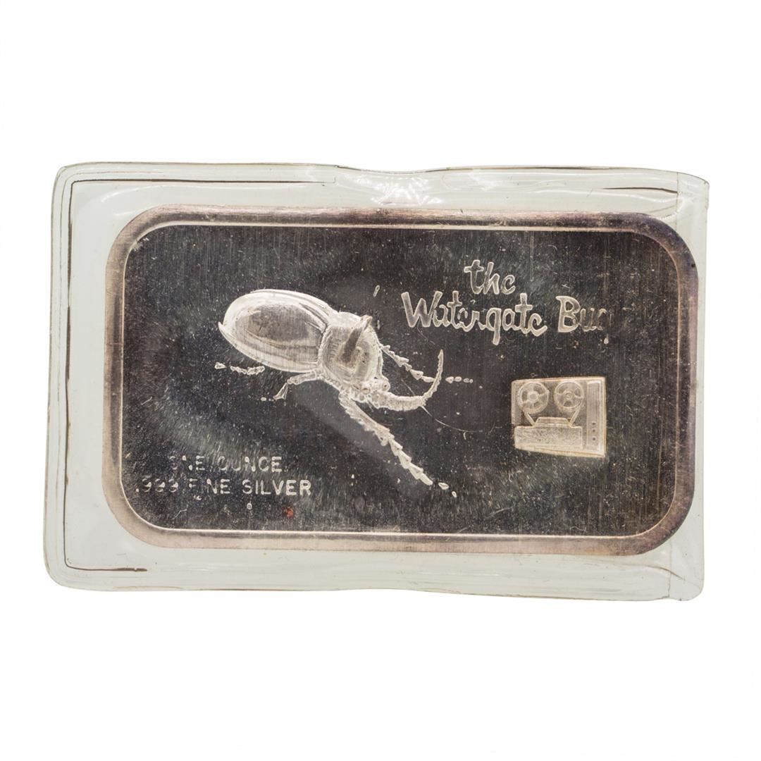 One 1973 The Watergate Bug Colonial Mint 1 oz .999 Fine Silver Art Bar.