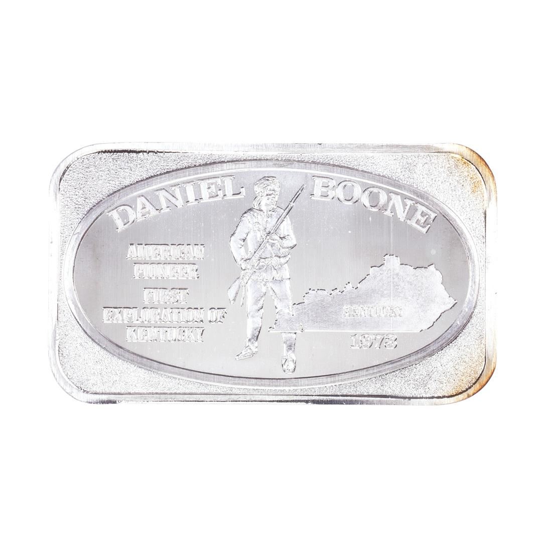 One 1973 U.S. Silver Corporation Daniel Boone 1oz .999 Fine Silver Art Bar.