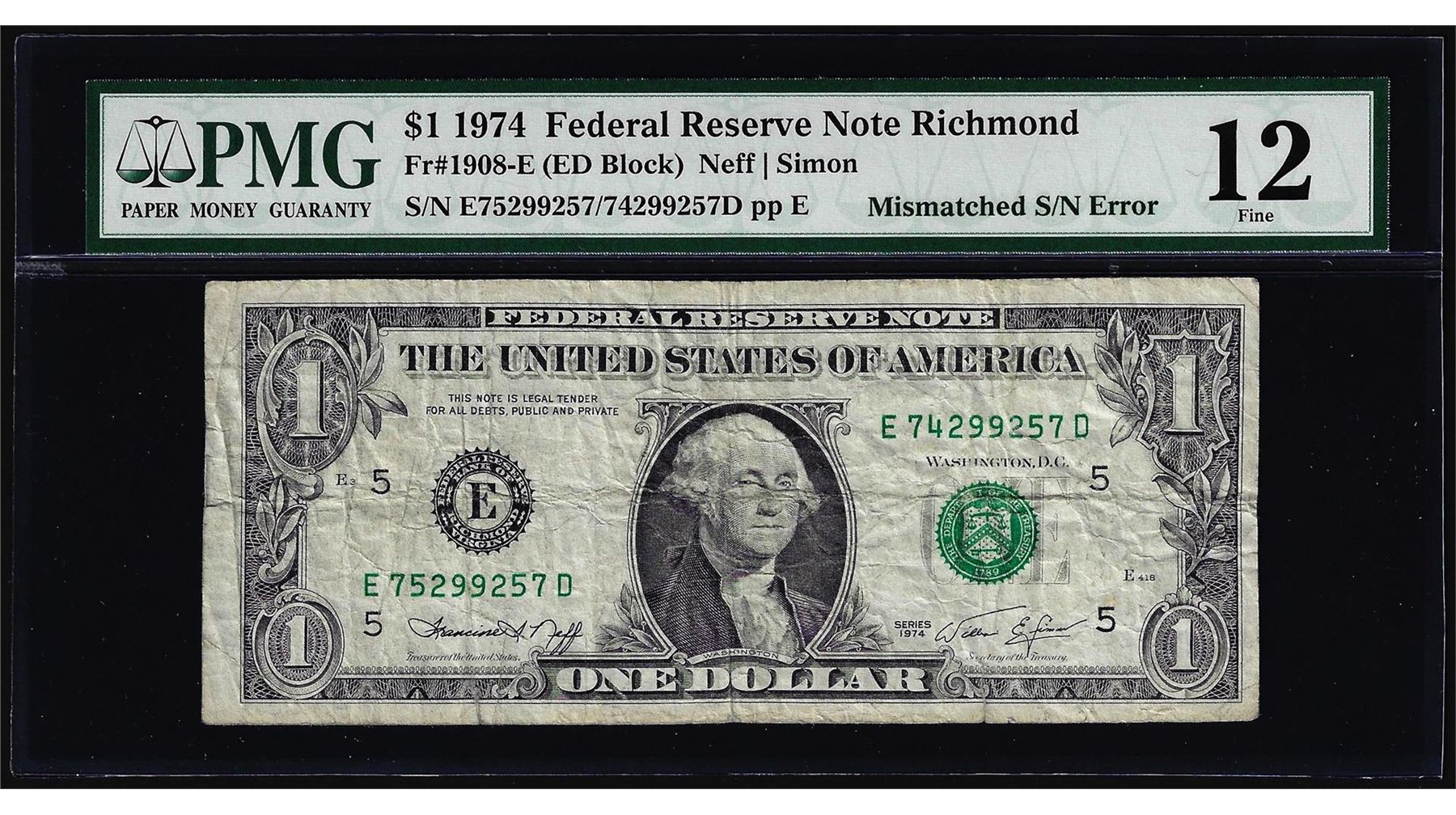 One 1974 $1 Federal Reserve Note Mismatched Serial Number ERROR PMG Fine 12. PMG Certified.