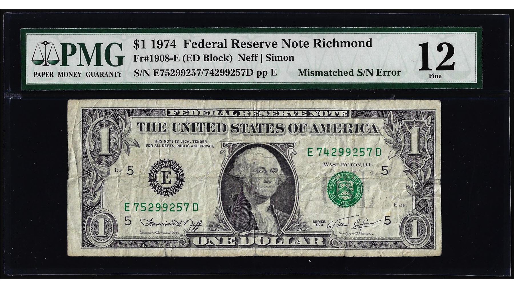 One 1974 $1 Federal Reserve Note Mismatched Serial Number Error Fr.1908-E PMG Fine 12. PMG Certified.