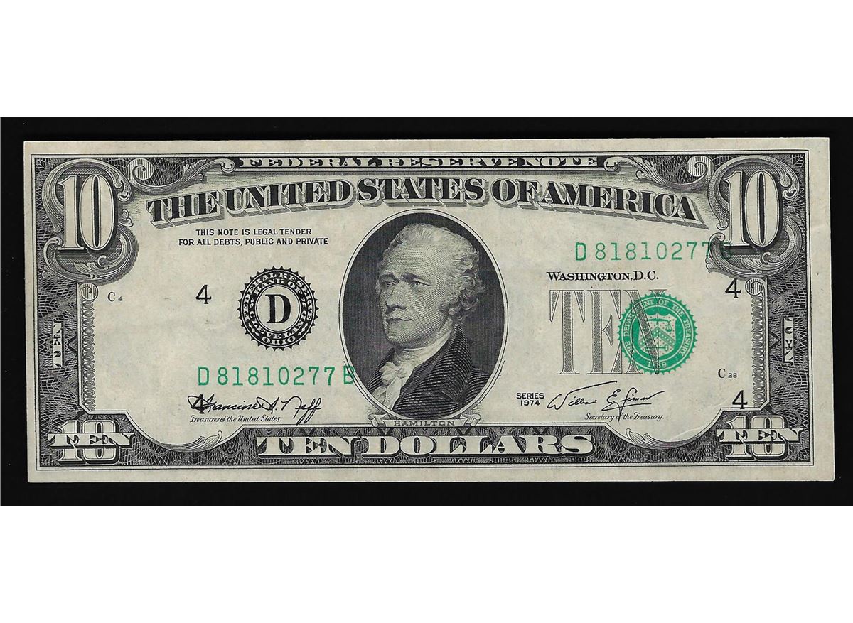 One 1974 $10 Federal Reserve Note Misalignment ERROR.