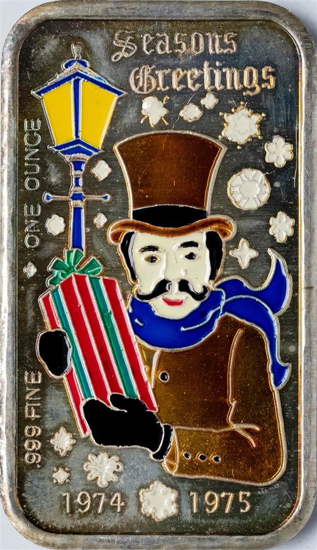 One 1974-1975 Season's Greetings Enamel Silver Art Bar.