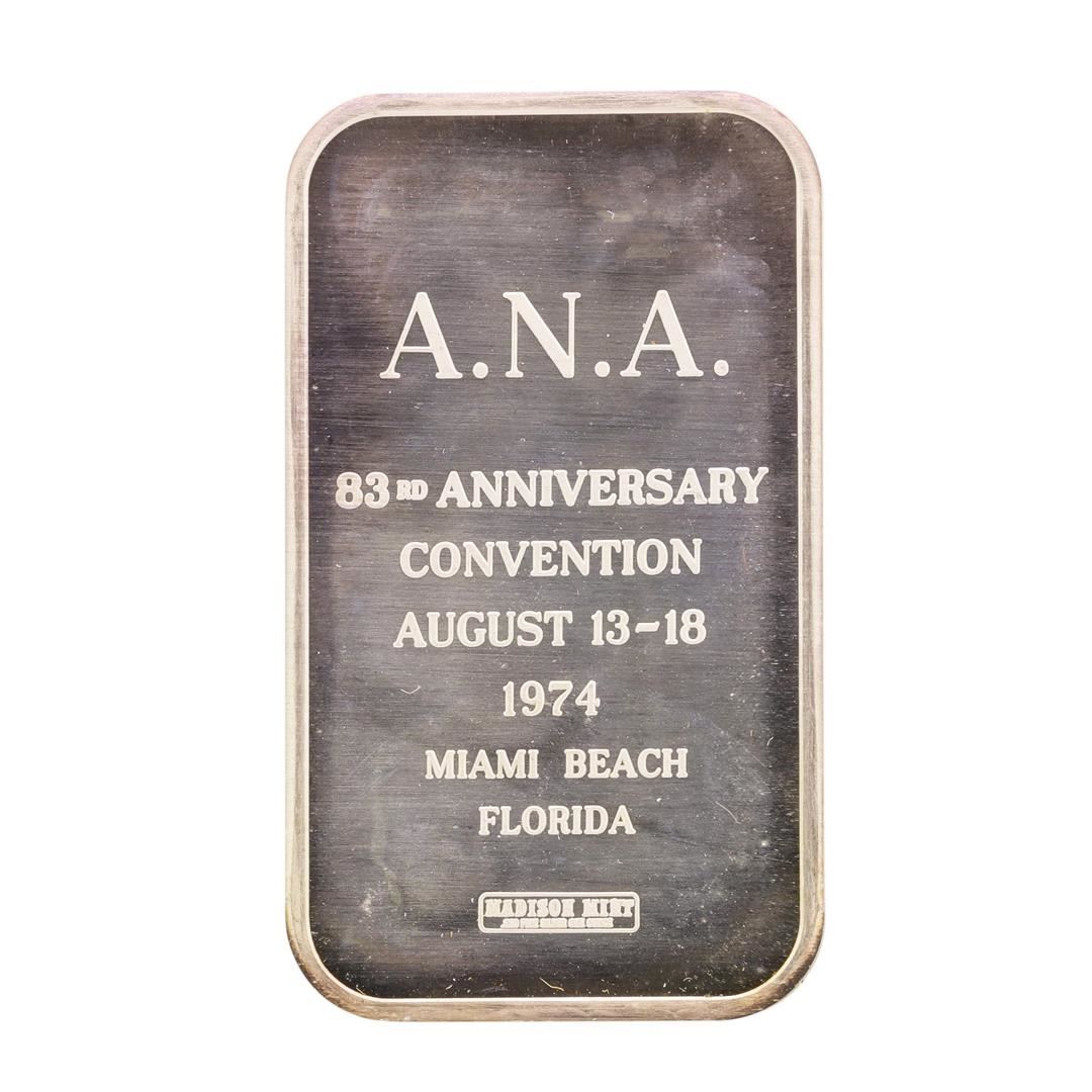 One 1974 ANA Convention Florida 1 oz .999 Fine Silver Art Bar.