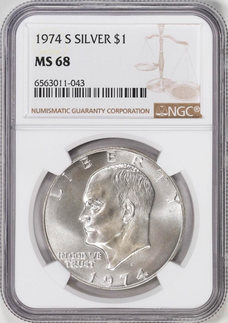 One 1974-S $1 Eisenhower Silver Dollar Coin NGC MS68. NGC Certified.