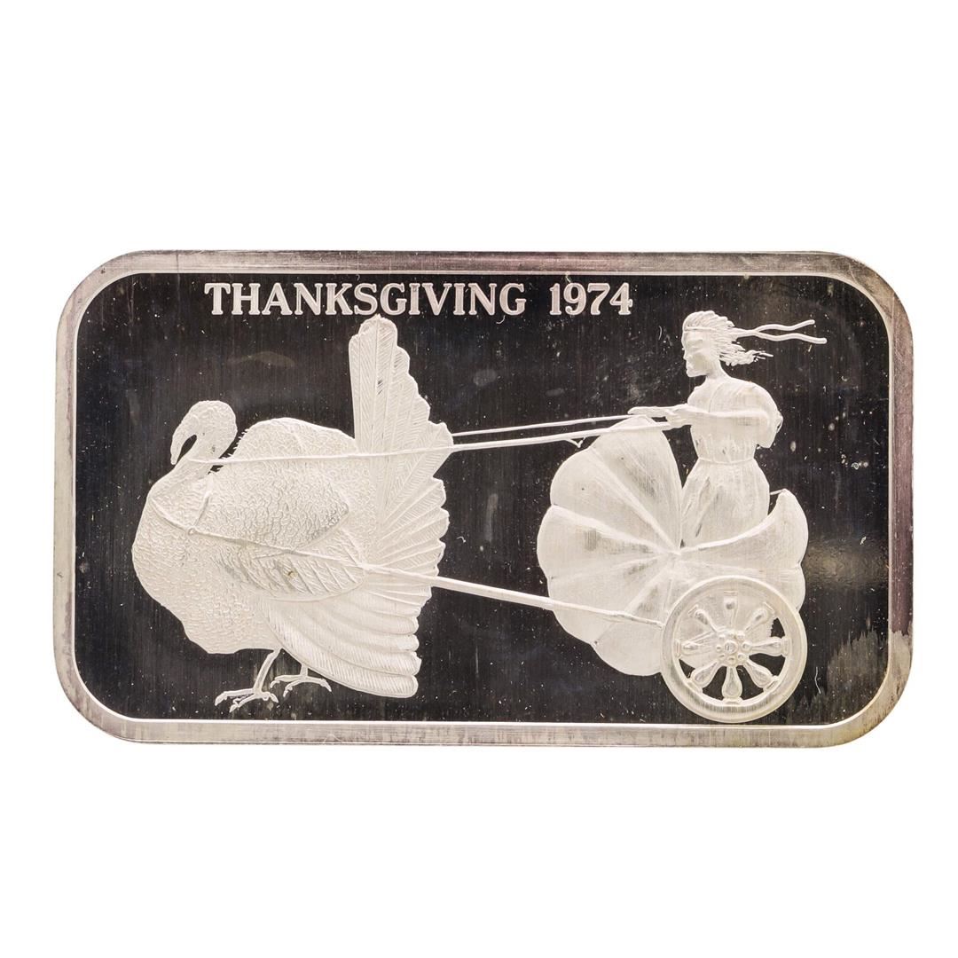 One 1974 Thanksgiving Madison Mint 1 oz .999 Fine Silver Art Bar.