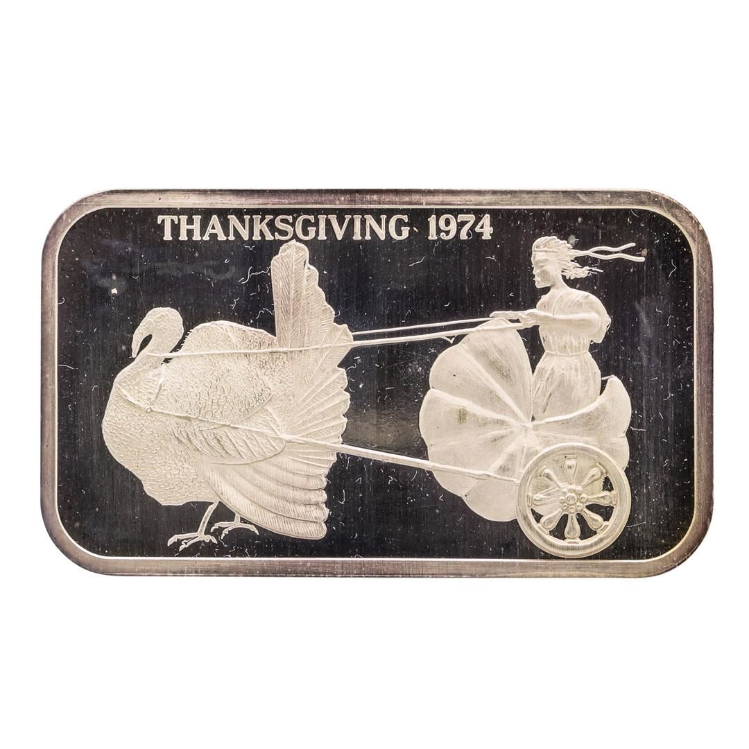 One 1974 Thanksgiving Madison Mint 1 oz .999 Fine Silver Art Bar.