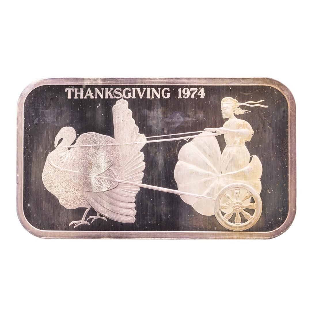 One 1974 Thanksgiving Madison Mint 1 oz .999 Fine Silver Art Bar.