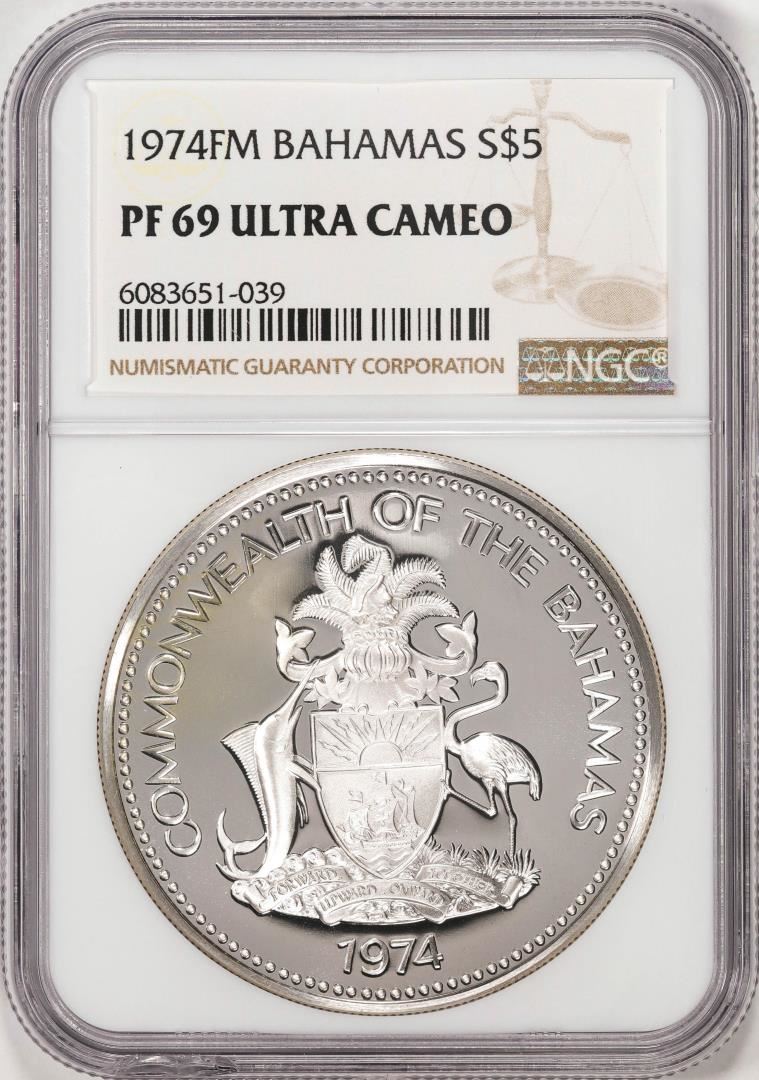 One 1974FM Bahamas $5 Proof Commonwealth Silver Coin NGC PF69 Ultra Cameo. NGC Certified.