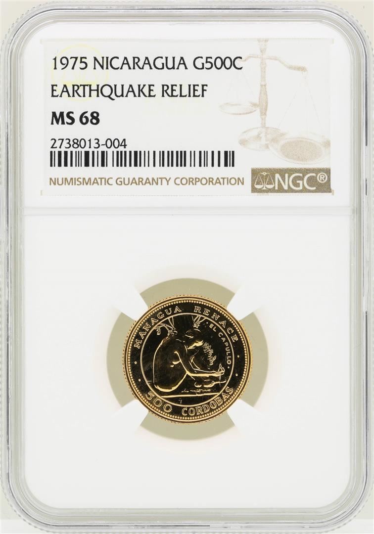 One 1975 Nicaragua 500 Cordobas Gold Coin NGC MS68. NGC Certified.