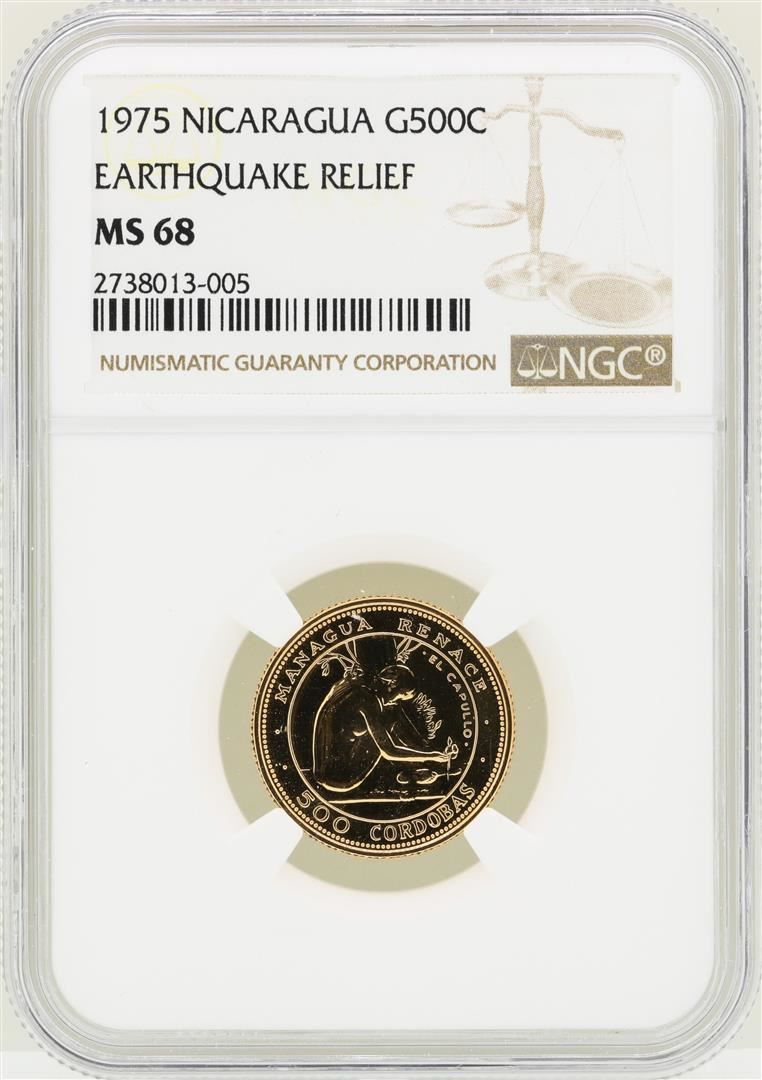 One 1975 Nicaragua 500 Cordobas Gold Coin NGC MS68. NGC Certified.