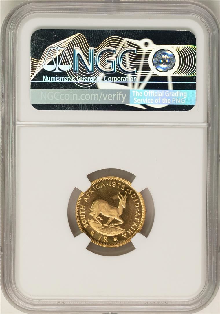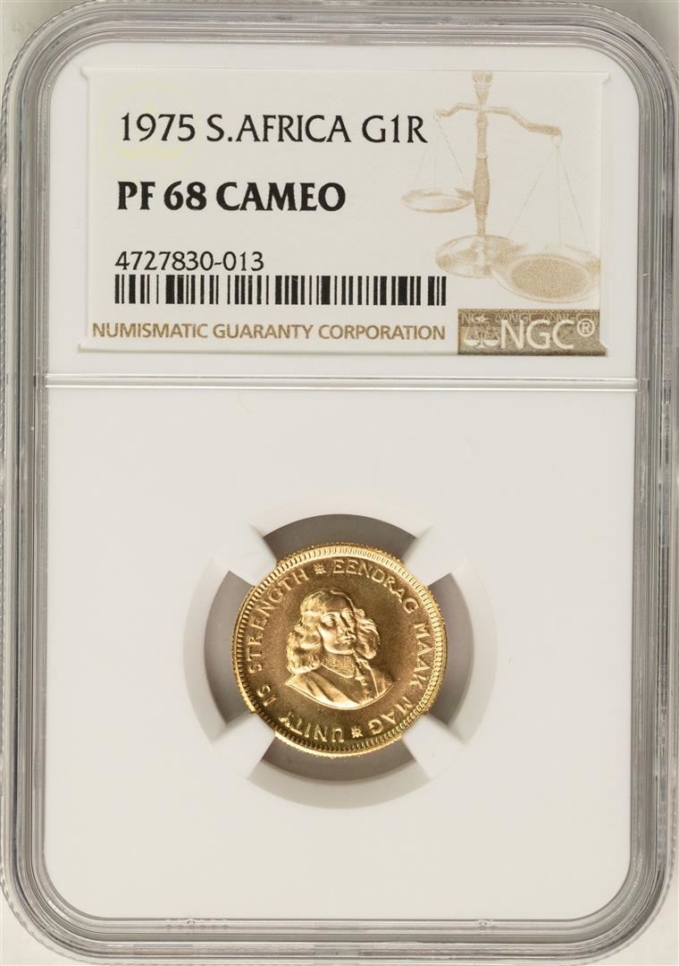 One 1975 South Africa 1 Rand Proof Gold Coin NGC PF68 Cameo. NGC Certified.