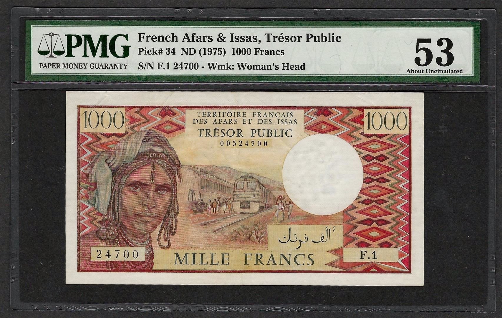 One 1975 Tresor Public French Afras & Issas 1000 Francs Note PMG About Uncirculated 53. PMG Certified.