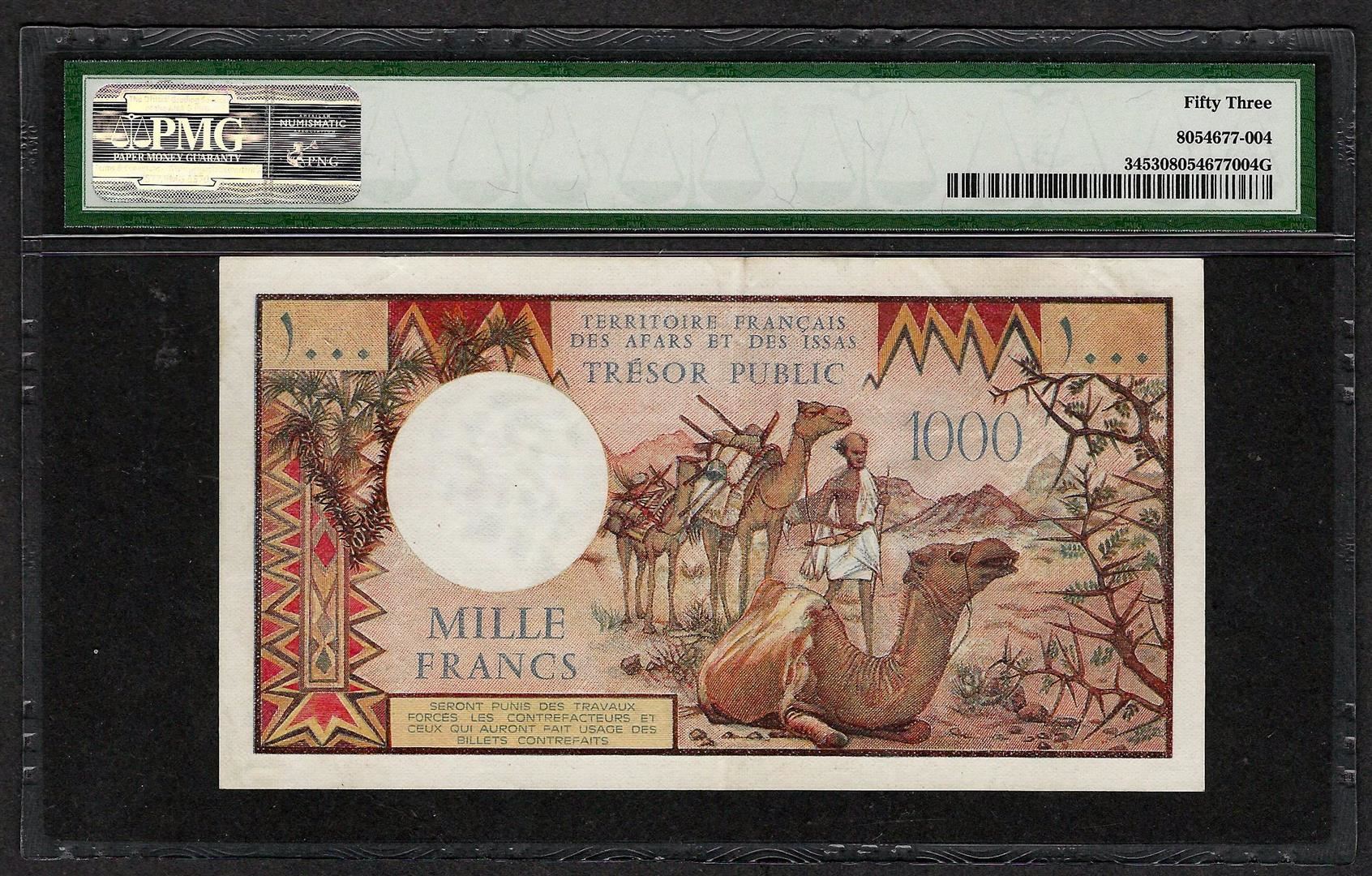 One 1975 Tresor Public French Afras & Issas 1000 Francs Note PMG About Uncirculated 53. PMG Certified.