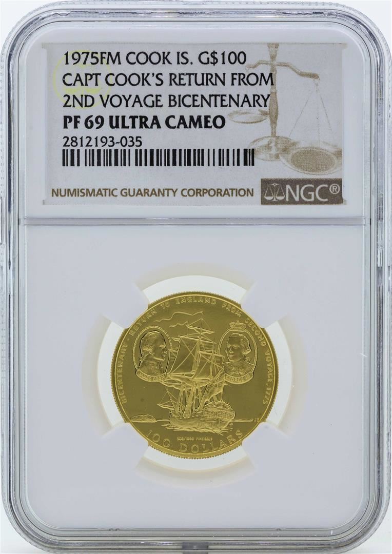 One 1975FM $100 Cook Islands Captain Cooks Return Gold Coin NGC PF69 Ultra Cameo. NGC Certified.