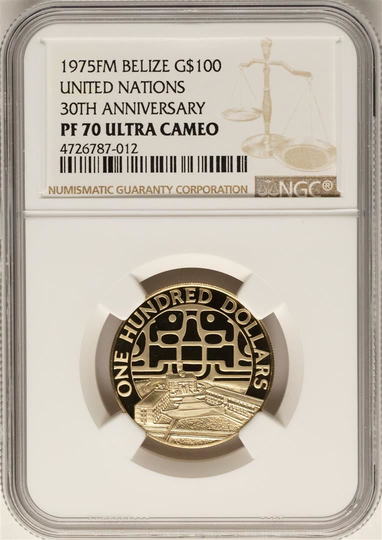 One 1975FM Belize $100 Gold Coin United Nations NGC PF70 Ultra Cameo. NGC Certified.