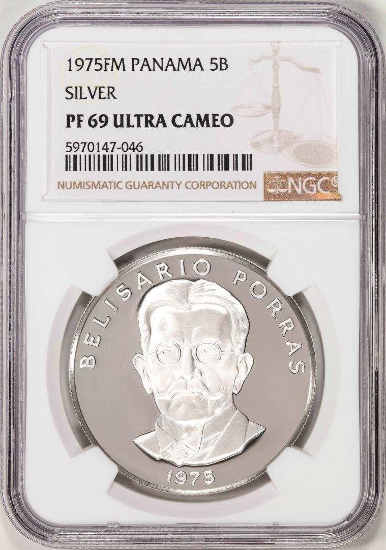 One 1975FM Panama 5 Balboas Proof Belisario Porras Silver Coin NGC PF69 Ultra Cameo. NGC Certified.