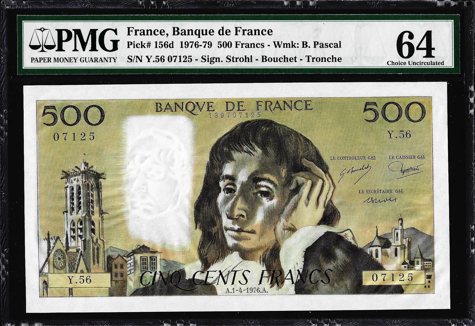 One 1976-1979 France Banque de France 500 Francs Note Pick# 156d PMG Choice Uncirculated 64. PMG Certified.