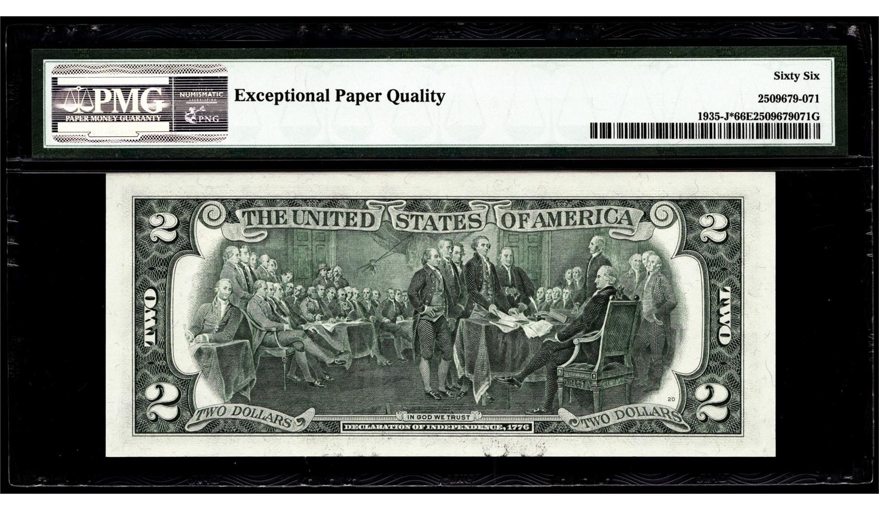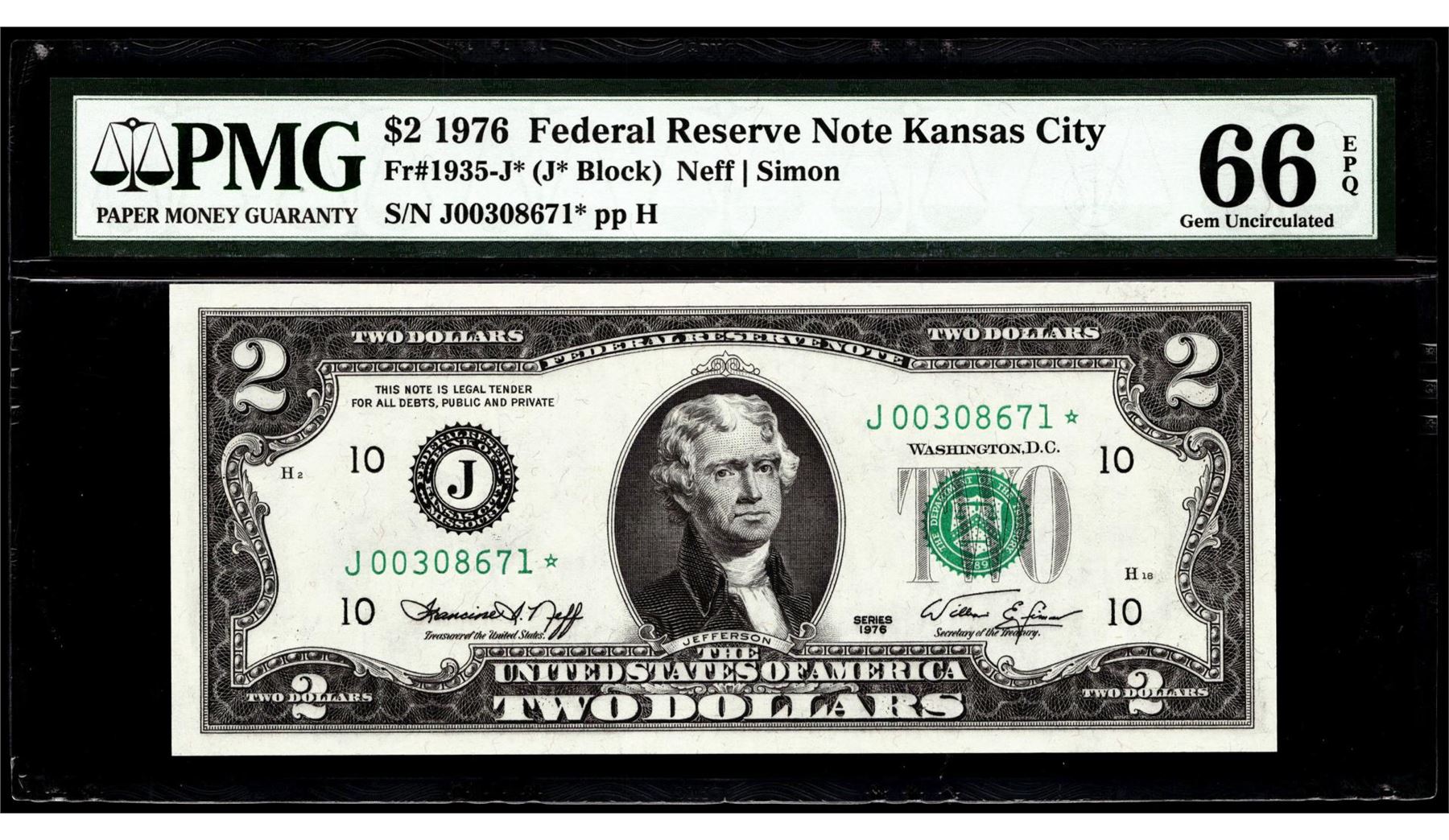One 1976 $2 Federal Reserve STAR Note Kansas City Fr.1935-J* PMG Gem Uncirculated 66EPQ. PMG Certified.