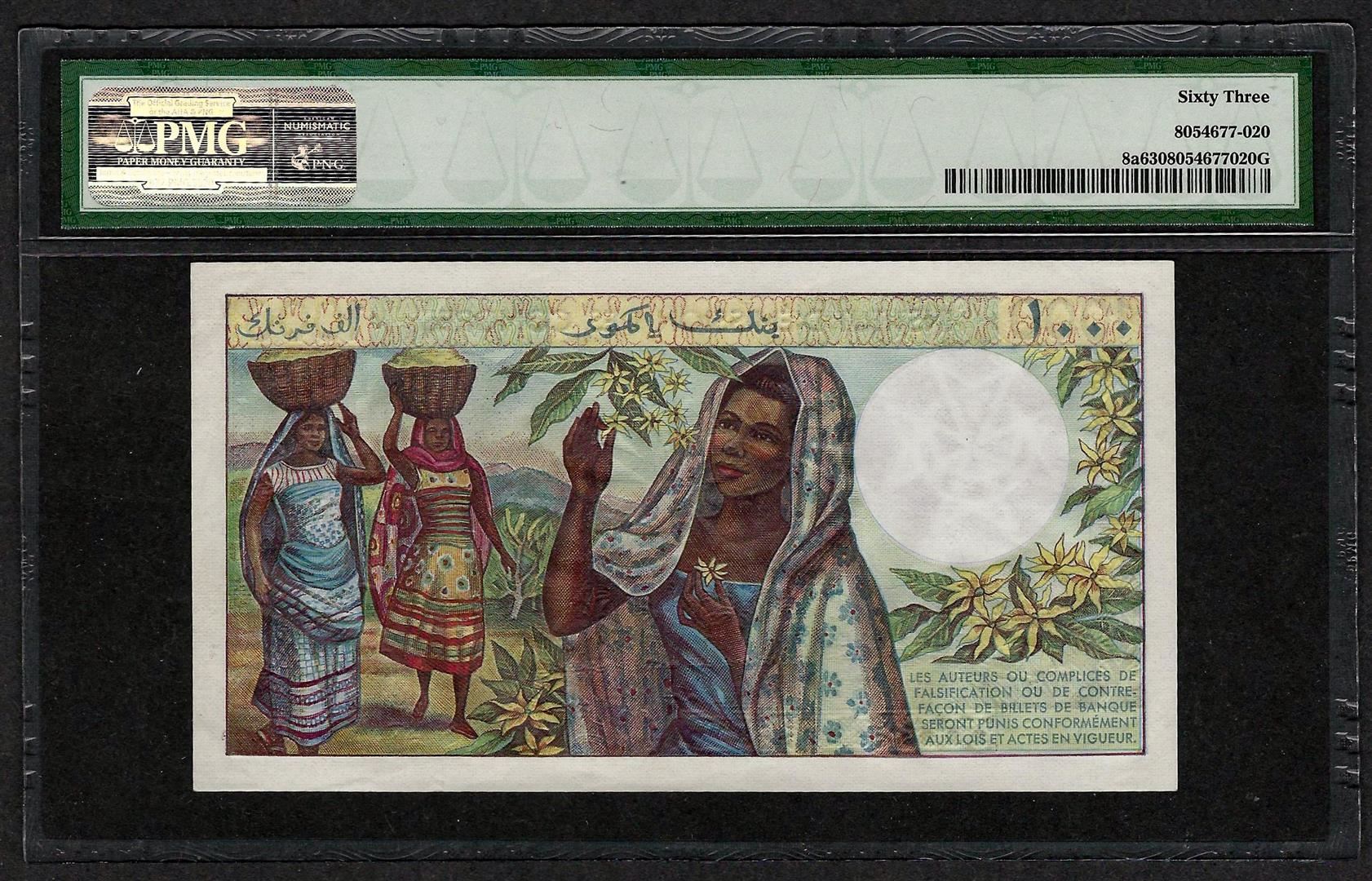 One 1976 Comoros Institut d'Emission 1000 Francs Currency Note PMG Choice Uncirculated 63. PMG Certified.