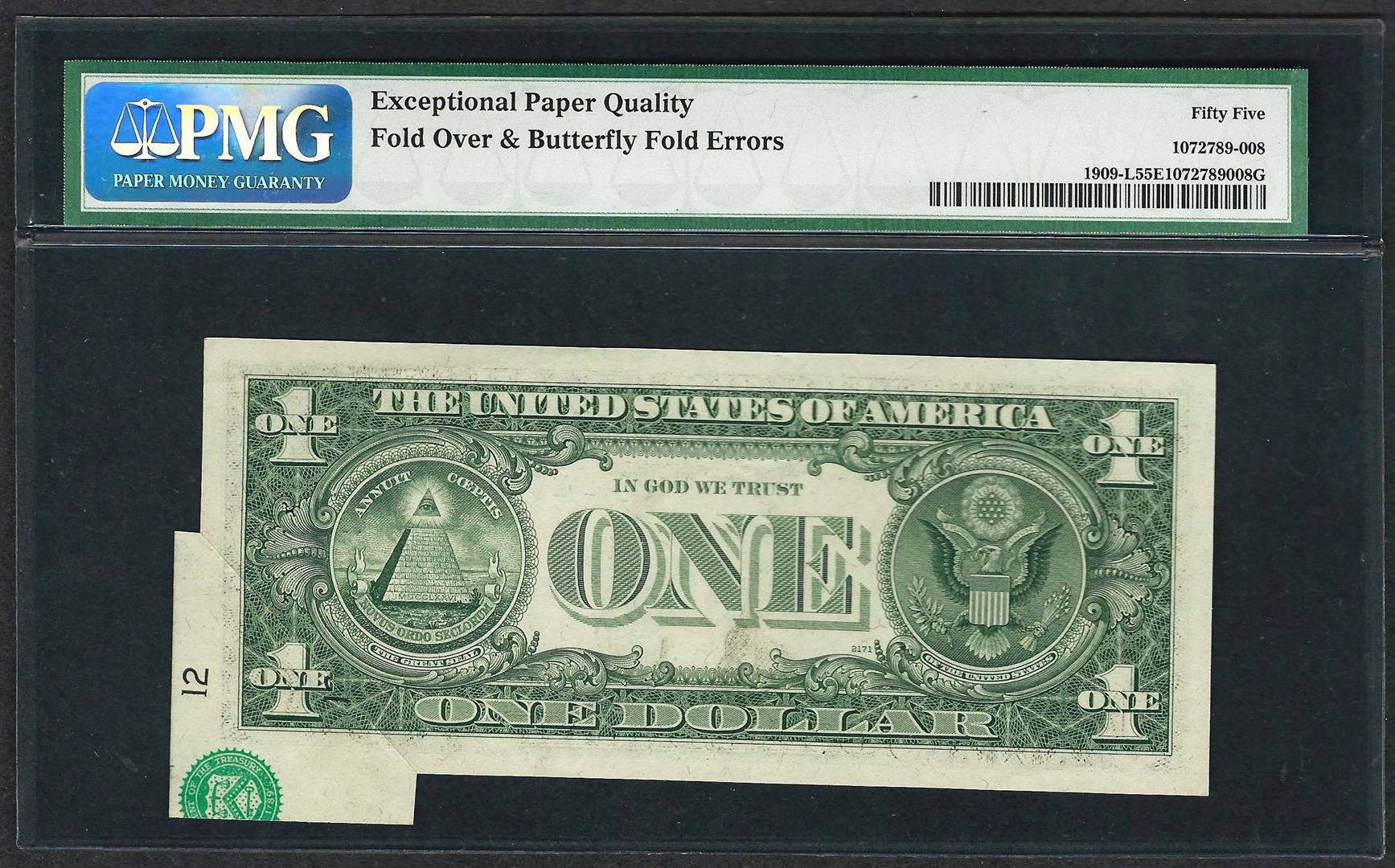 One 1977 $1 Federal Reserve Note ERROR Fold Over Butterfly Fold PMG AU 55EPQ. PMG Certified.