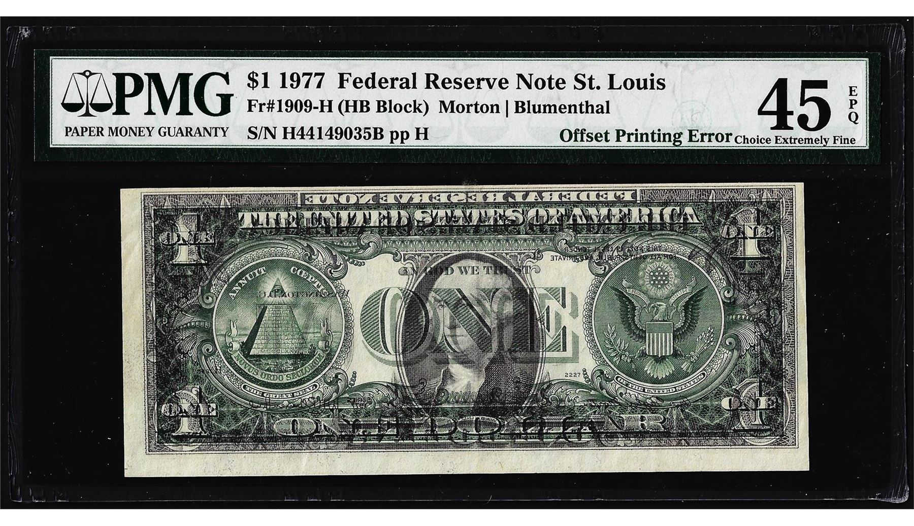 One 1977 $1 Federal Reserve Note Offset Printing ERROR PMG Choice Extremely Fine 45EPQ. PMG Certified.