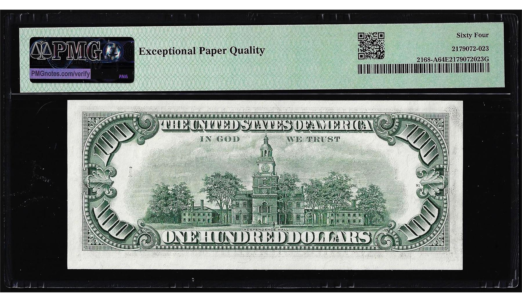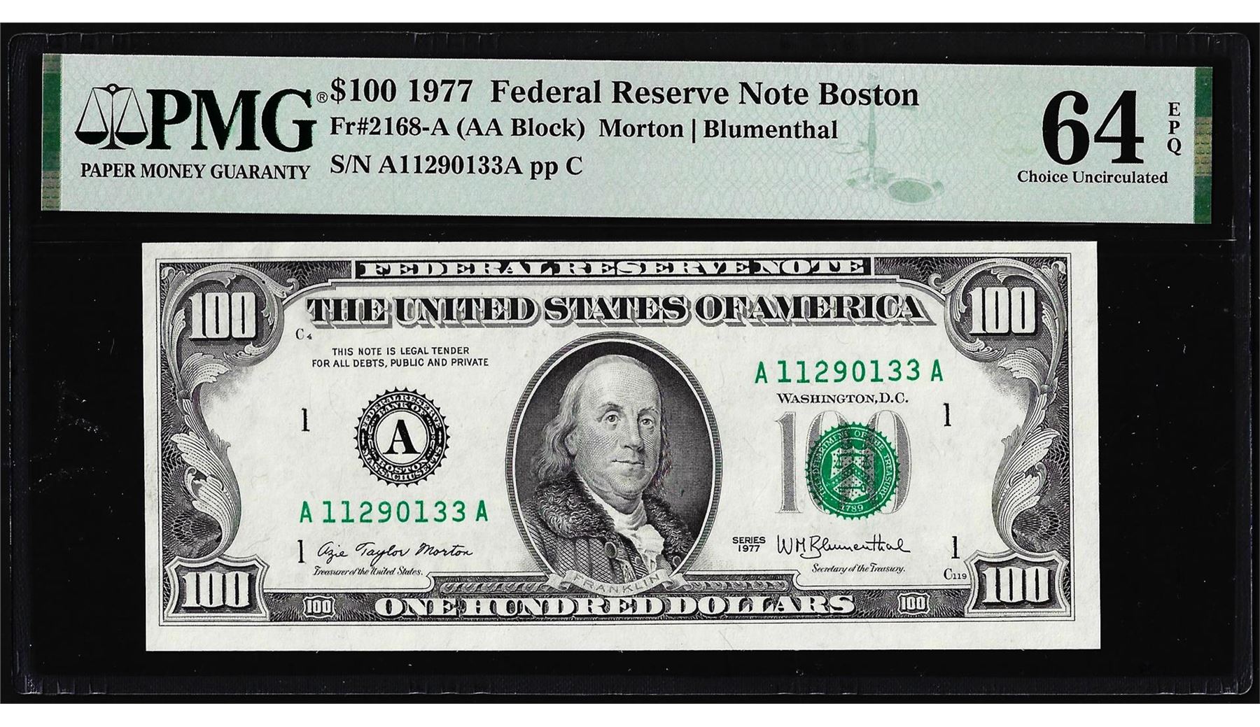 1977 $100 Federal Reserve Note Boston Fr.2168-A PMG Choice Uncirculated 64EPQ