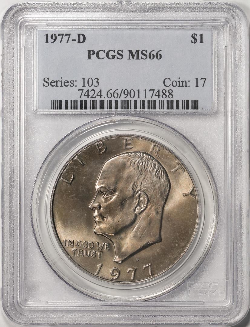 One 1977-D $1 Eisenhower Dollar Coin PCGS MS66. PCGS Graded.