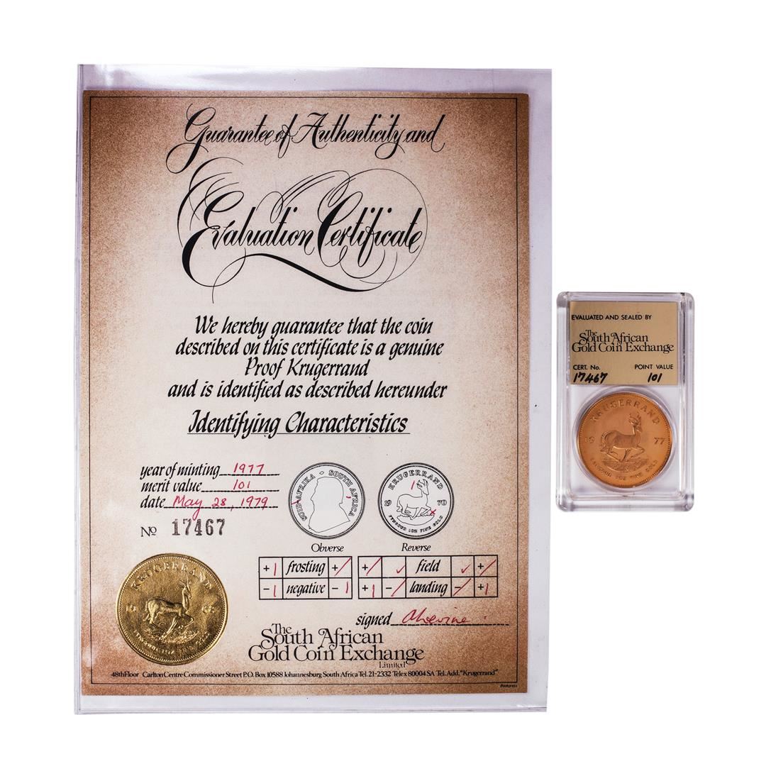 One 1977 Proof South Africa 1oz Krugerrand Gold Coin w/COA.