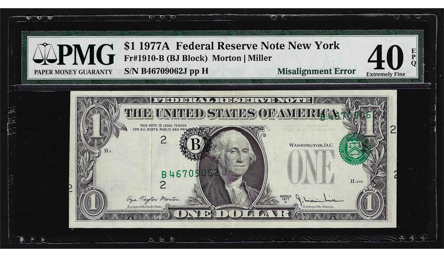 One 1977A $1 Federal Reserve Note ERROR Misalignment PMG Extremely Fine 40EPQ. PMG Certified.