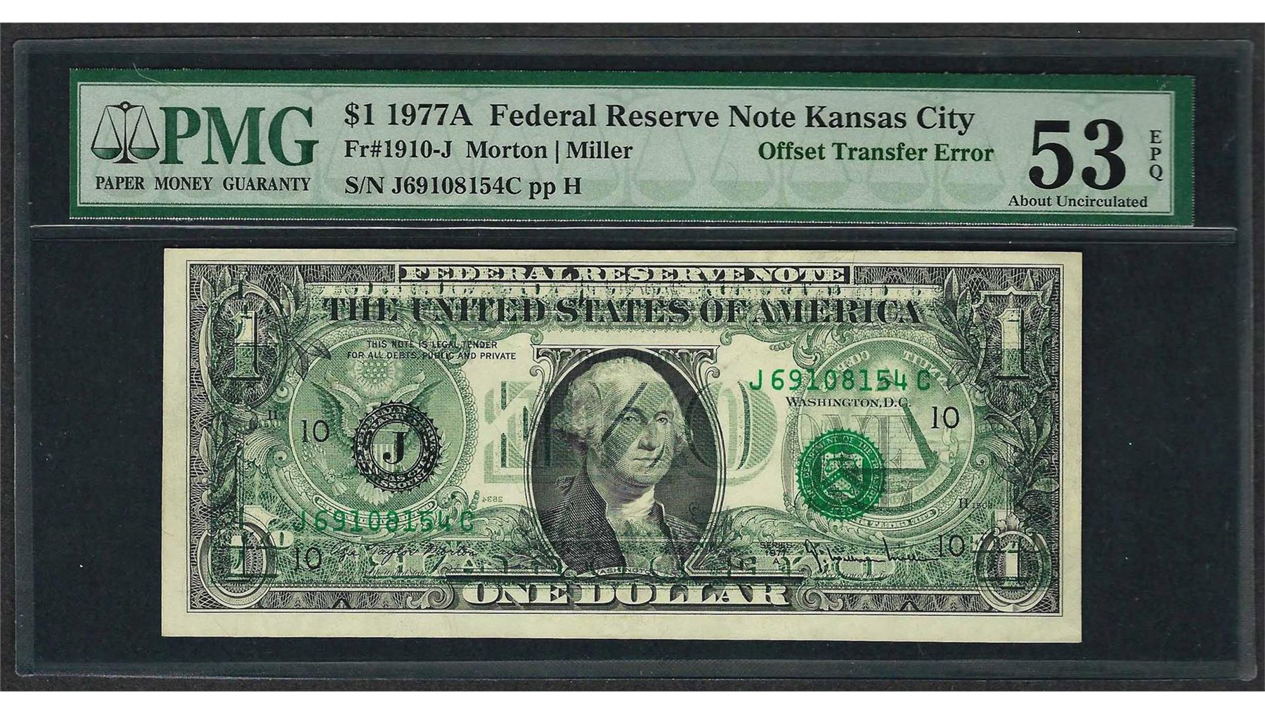 One 1977A $1 Federal Reserve Note ERROR Offset Transfer PMG About Uncirculated 53EPQ. PMG Certified.