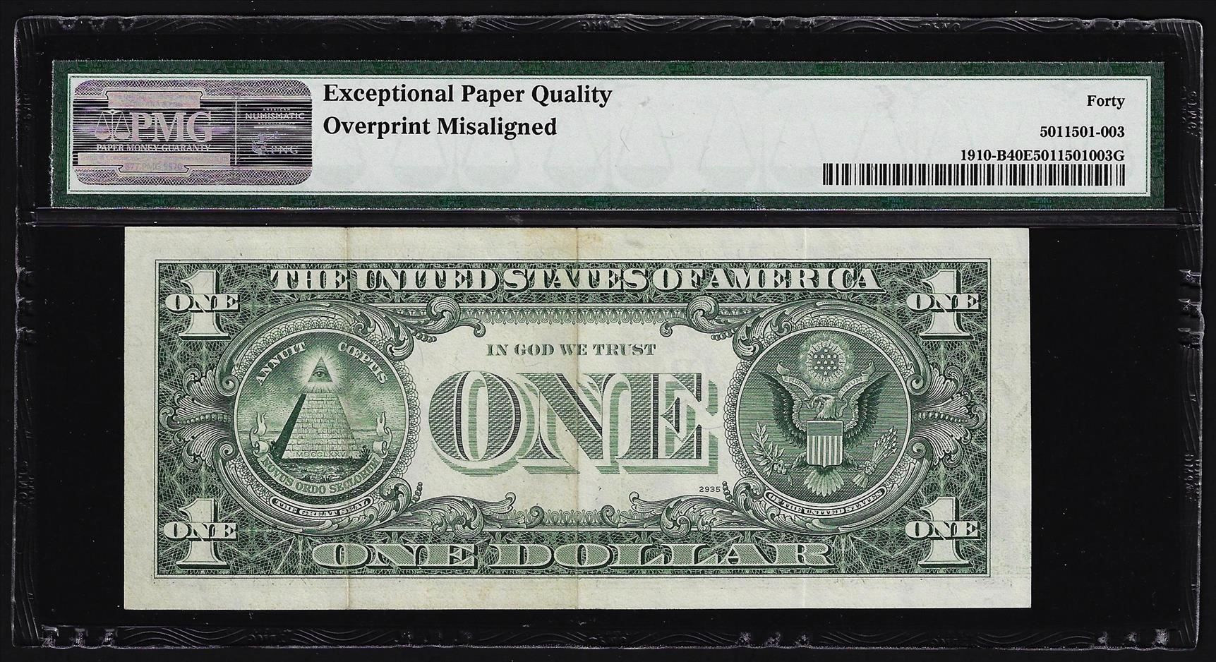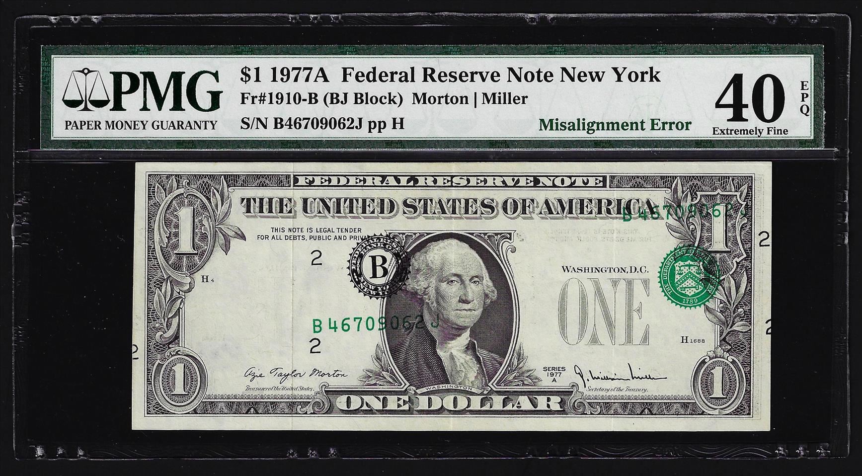 One 1977A $1 Federal Reserve Note Misalignment ERROR PMG Extremely Fine 40EPQ. PMG Certified.