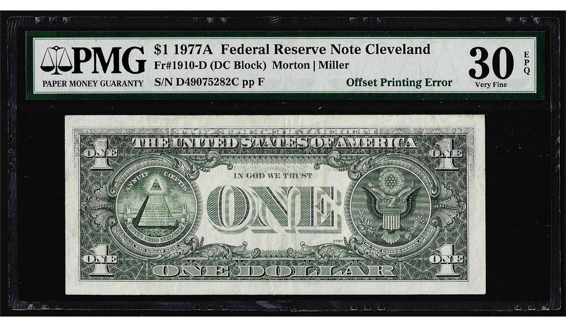 One 1977A $1 Federal Reserve Note Offset Printing ERROR PMG Very Fine 30EPQ. PMG Certified.