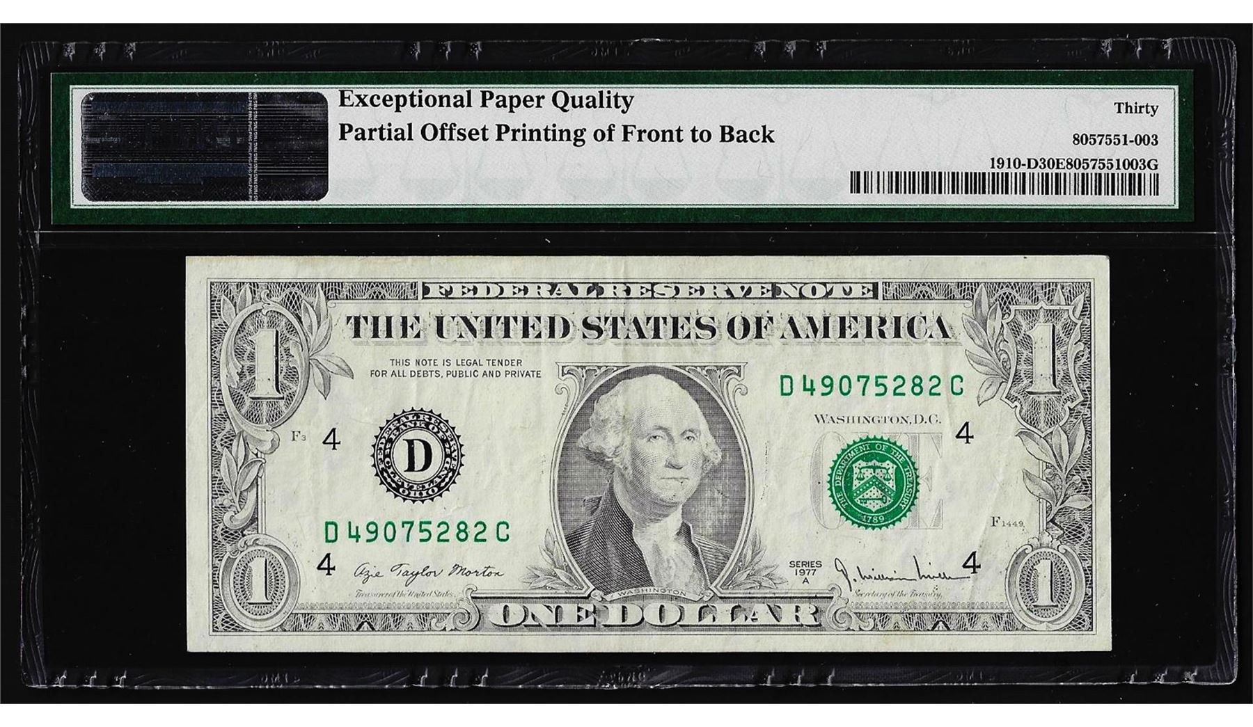 One 1977A $1 Federal Reserve Note Offset Printing ERROR PMG Very Fine 30EPQ. PMG Certified.