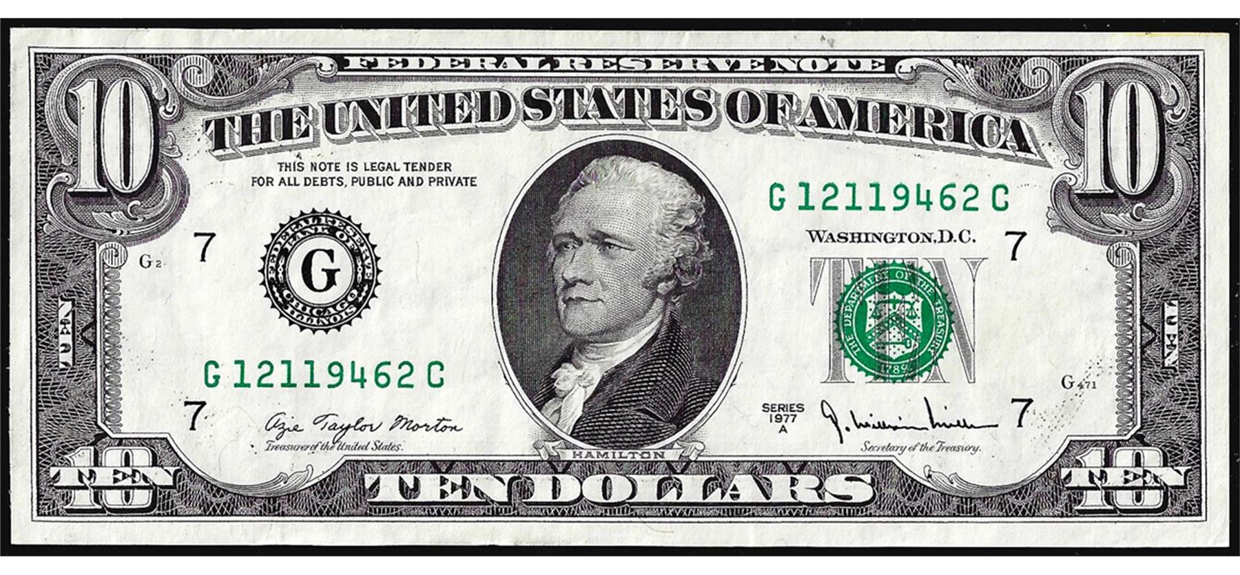 One 1977A $10 Federal Reserve Note Chicago Full Offset ERROR.