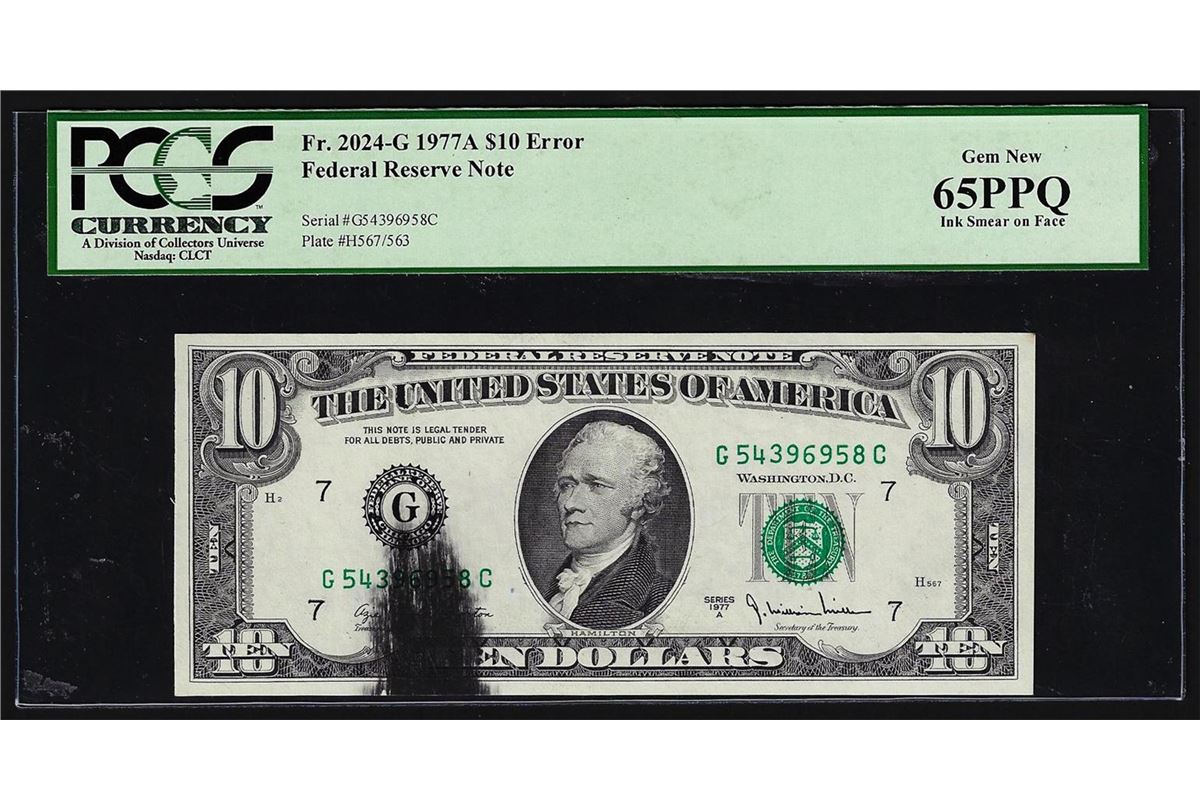 One 1977A $10 Federal Reserve Note ERROR Ink Smear PCGS Gem New 65PPQ. PCGS Graded.