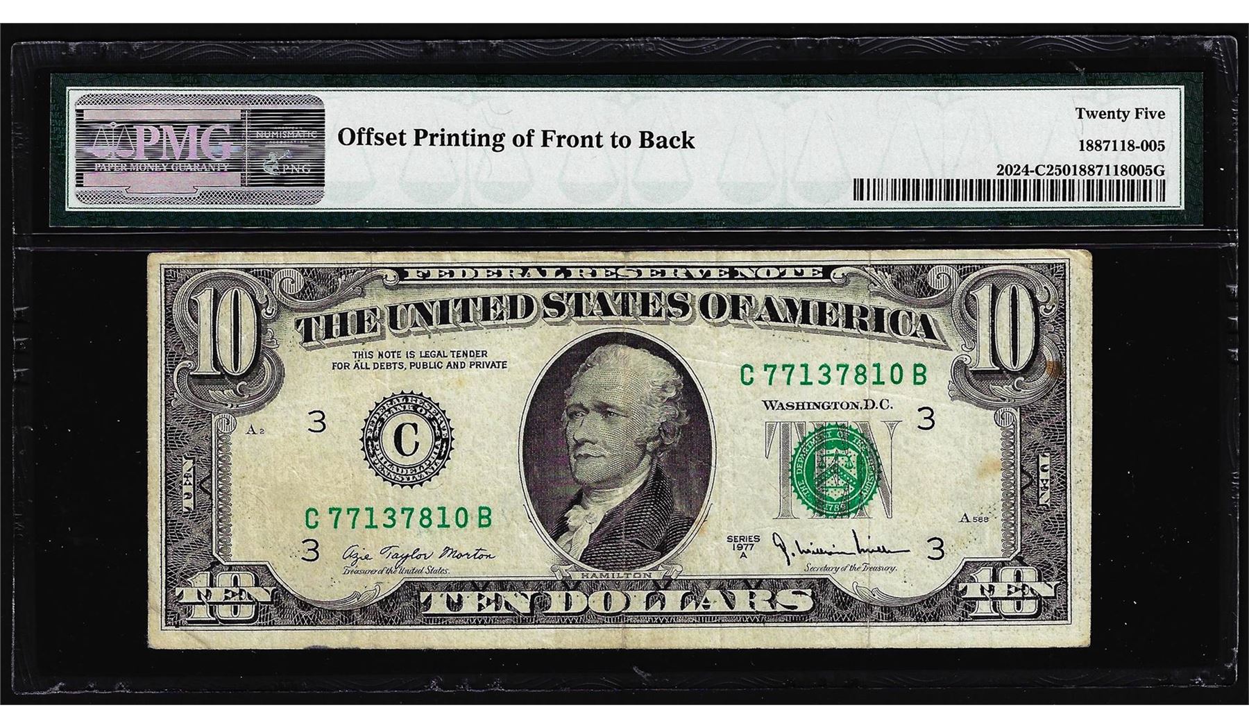 One 1977A $10 Federal Reserve Note Offset Printing ERROR PMG Very Fine 25. PMG Certified.