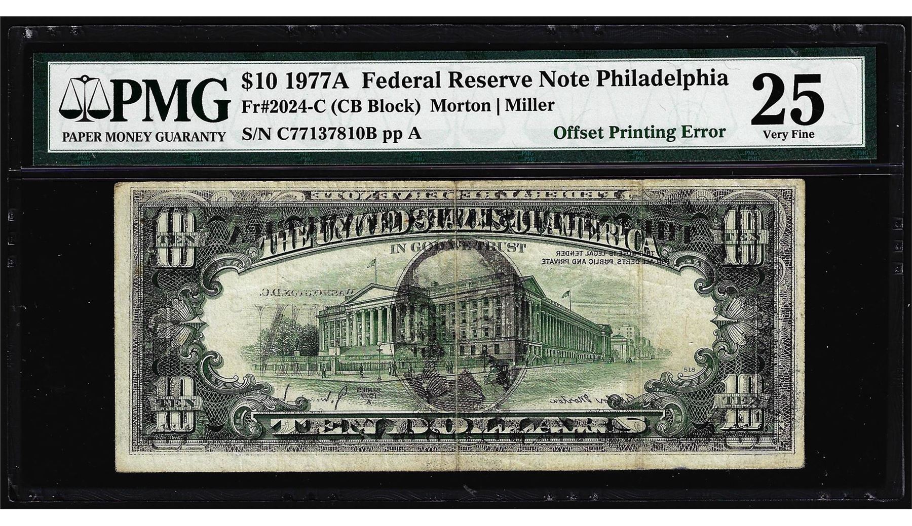 One 1977A $10 Federal Reserve Note Offset Printing ERROR PMG Very Fine 25. PMG Certified.