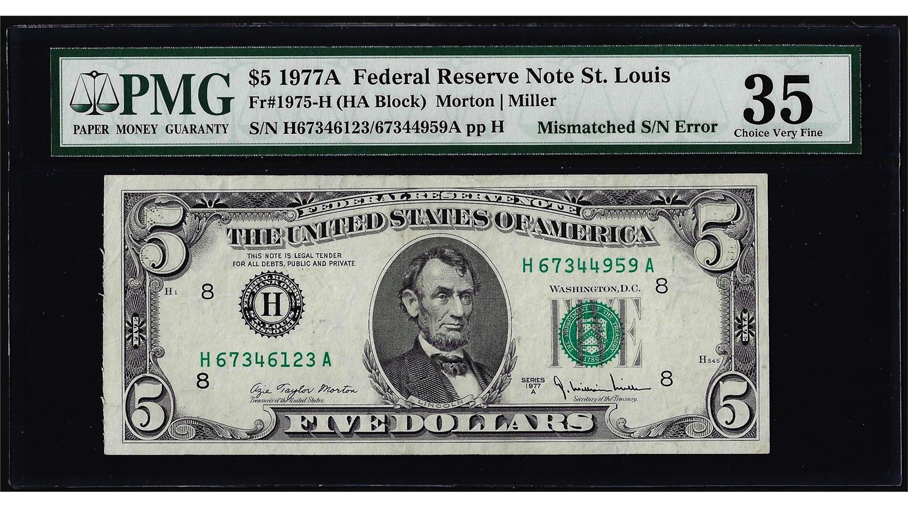 One 1977A $5 Federal Reserve Note Mismatched Serial Number ERROR PMG Very Fine 35. PMG Certified.