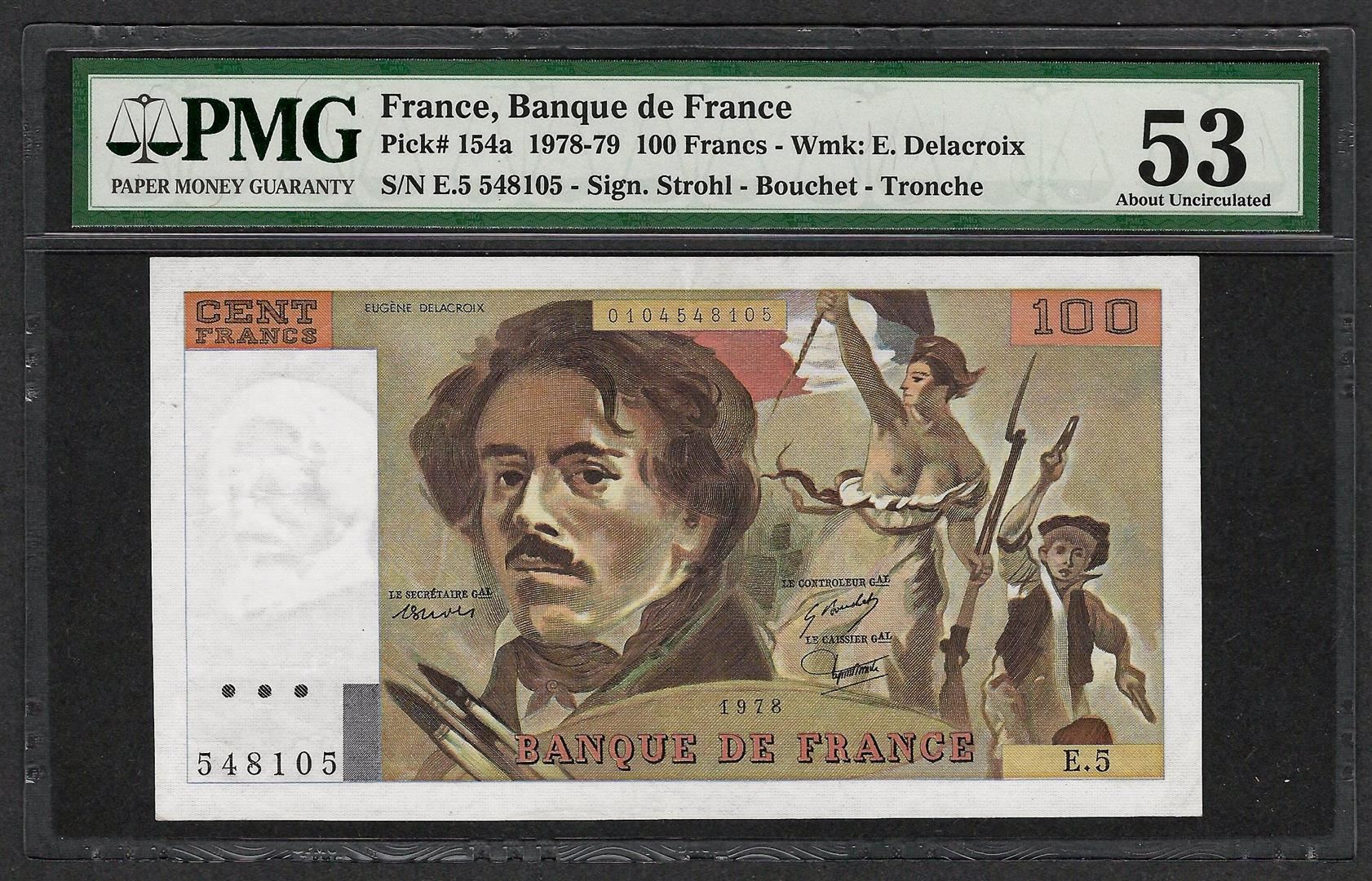 1978-79 Banque de France 100 Francs Currency Note Pick 154a PMG About Uncirculated 53