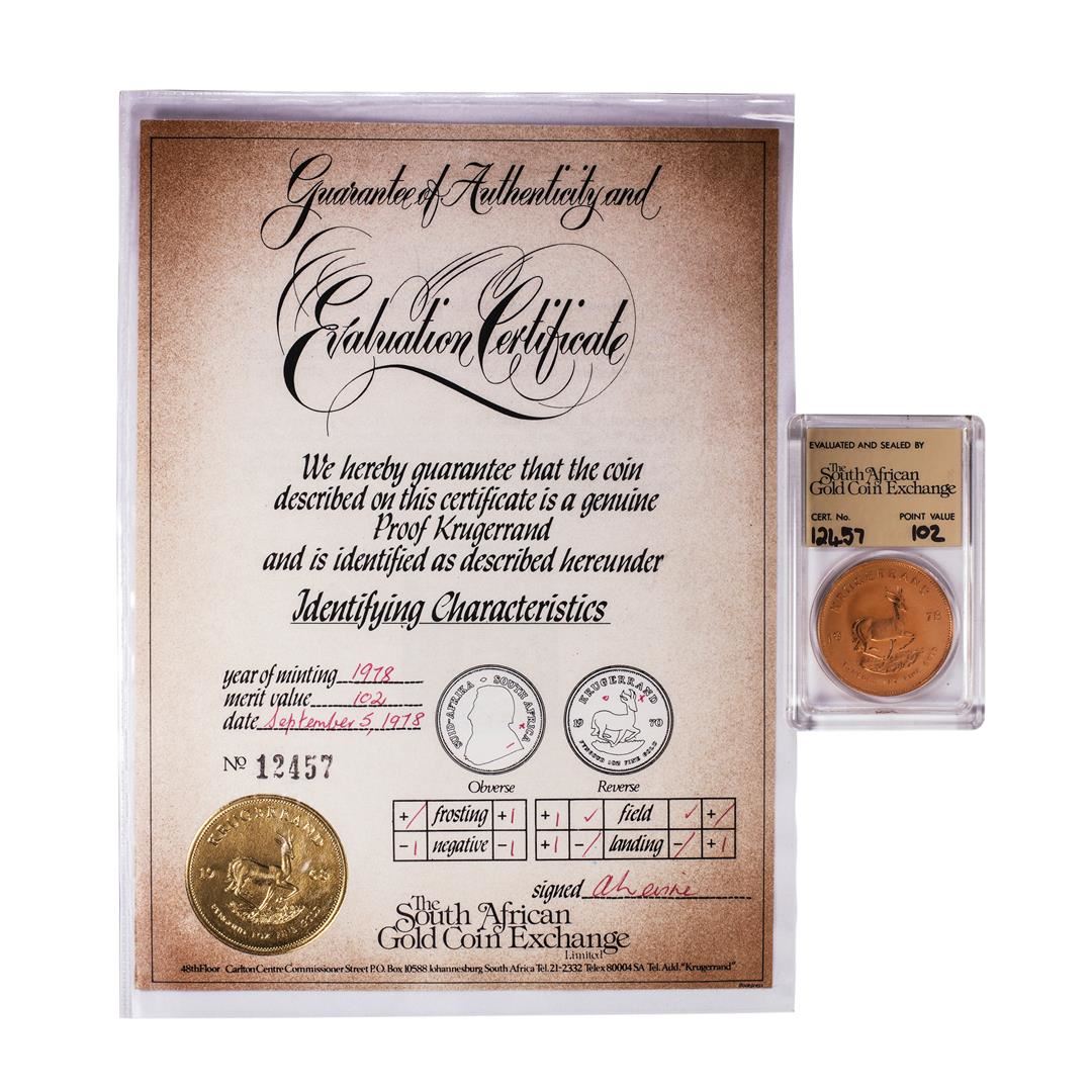 One 1978 Proof South Africa 1oz Krugerrand Gold Coin w/COA.
