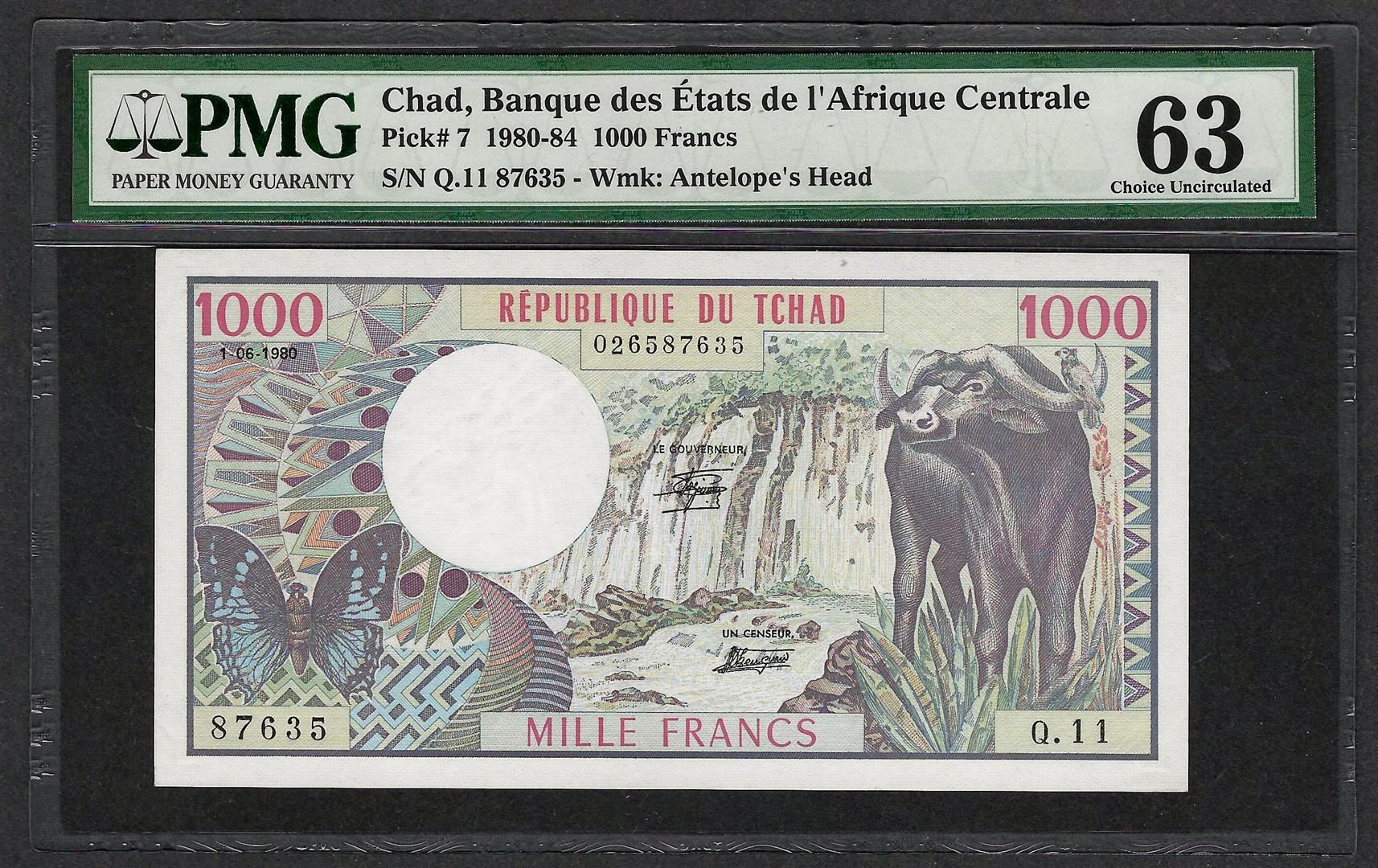 1980-84 Banque Etats Chad Africa 1000 Francs Note Pick# 7 PMG Choice Uncirculated 63