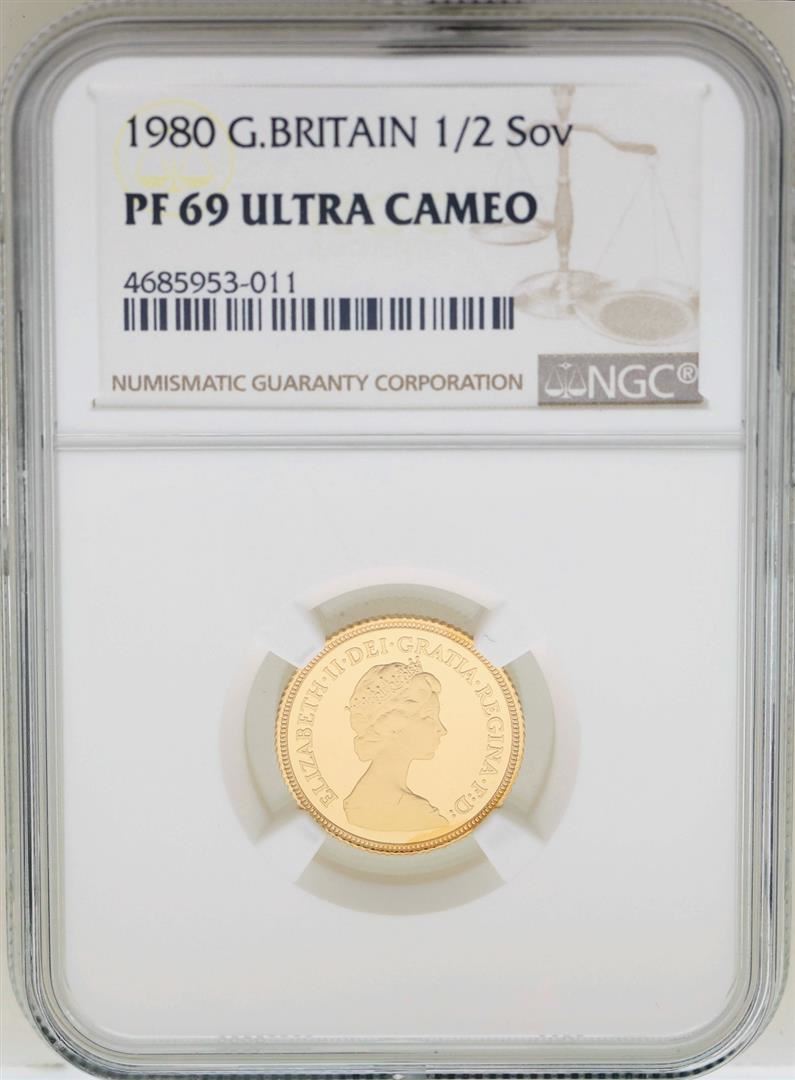 One 1980 Great Britain 1/2 Sovereign Gold Coin NGC PF69 Ultra Cameo. NGC Certified.