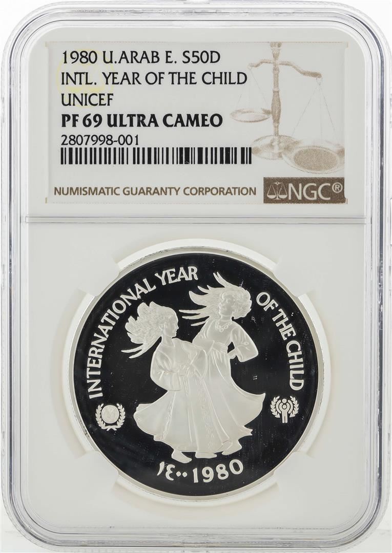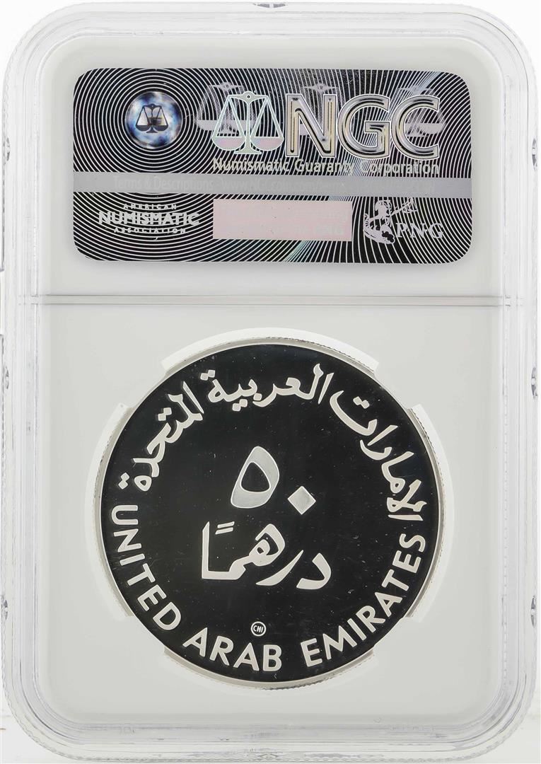 One 1980 United Arab Emirates 50 Dirhams Silver Coin NGC PF69 Ultra Cameo. NGC Certified.