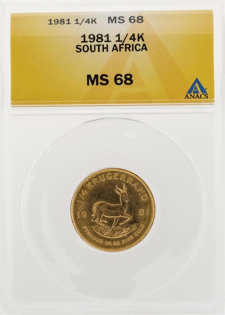 One 1981 1/4 oz South Africa Krugerrand Gold Coin ANACS MS68. ANACS Certified.